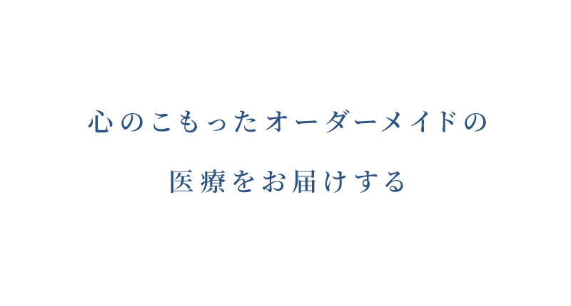 「心のこもったオーダーメイドの医療をお届けする」です。医療を通じて地域社会に貢献することを使命としています。とりわけ訪問診療に力を注ぎ、患者さんが安心して暮らせる地域づくりを目指しています。